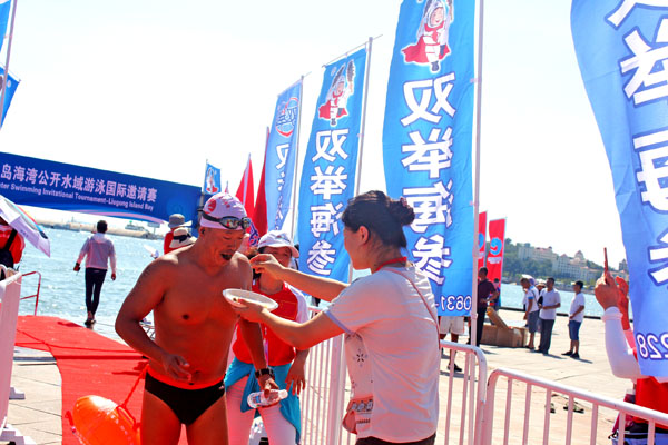 在橫渡劉公島海灣國(guó)際游泳邀請(qǐng)賽上,賽前,雙舉海參為選手們送上雙舉海參增加體力。