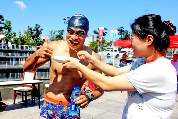 雙舉海參李巧燕(右一)在選手上岸后為泳士們送上口感鮮嫩的高壓即食海參補(bǔ)充體力。