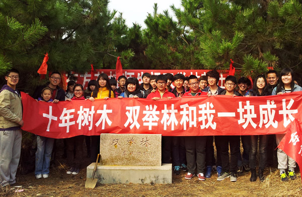 2013年,在這片“雙舉林”十年之際,李雙舉帶領(lǐng)員工和學(xué)子們一起來(lái)到這里,見(jiàn)證雙舉林成長(zhǎng)。