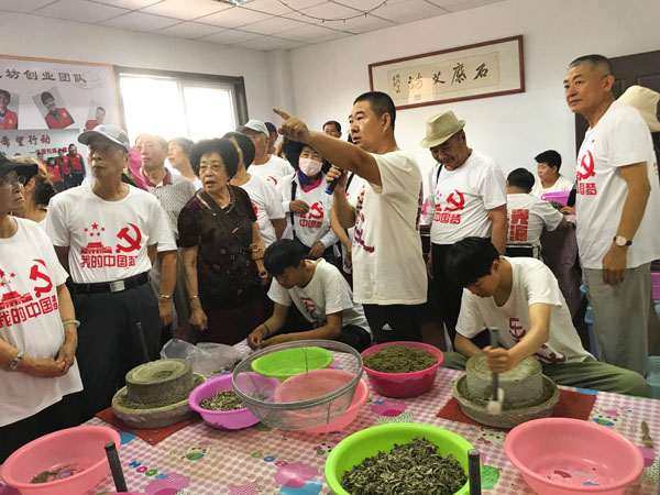 白手杖公益項目發(fā)起人姜新(中)向老黨員們介紹了由盲人帶動智障青年創(chuàng)業(yè)的“石磨艾坊”項目。