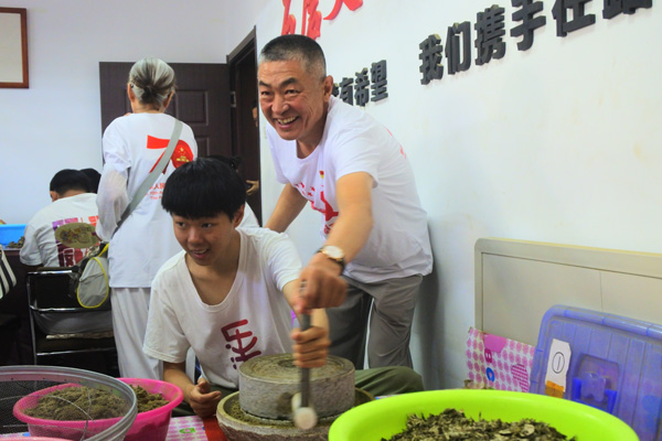 6月25日上午,身為環(huán)翠區(qū)環(huán)翠樓街道辦事處西北村黨總支所屬的思源黨支部書記的李雙舉同近百名黨員和志愿者來到威海市殘疾人就業(yè)服務(wù)中心,受到這里所有殘疾人的熱烈歡迎——首先,所屬的12名智障殘疾人為大家獻上了他們提前精心排練的歌伴舞節(jié)目;緊接著,威海市白手杖殘疾人分創(chuàng)新創(chuàng)業(yè)園發(fā)起人、知名盲人志愿者、帶動智障者參與創(chuàng)業(yè)的石磨艾坊創(chuàng)始人姜新發(fā)表了熱情洋溢的歡迎辭;隨后,一行興致勃勃地參觀了石磨艾坊加工車間和成品展示廳。
