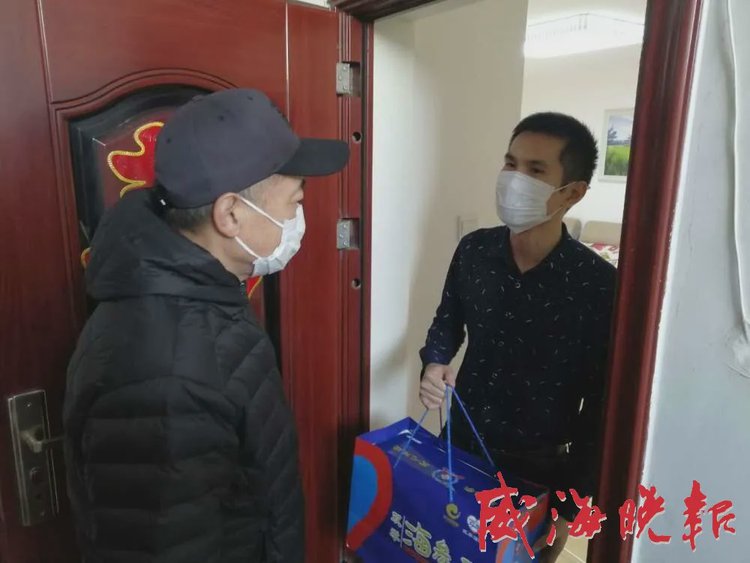 9時(shí)35分,李雙舉一行驅(qū)車(chē)來(lái)到雷小娟家樓前,她的愛(ài)人、在威海市立醫(yī)院任職的陳明浩聞?dòng)嵲缭绲群蛑?。他?duì)雙舉海參送上的“參”情厚意深表感謝。李雙舉真誠(chéng)地說(shuō):“你愛(ài)人在抗疫一線,我們是來(lái)致敬的,因?yàn)橛辛怂麄兊母冻觯覀兊纳畈庞斜U?!?
