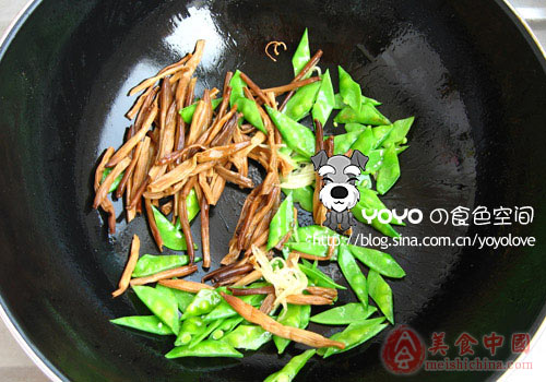 起鍋,燒熱油,爆響姜絲,下入泡好的黃花、荷蘭豆加入足量的清水和當(dāng)歸煮沸。