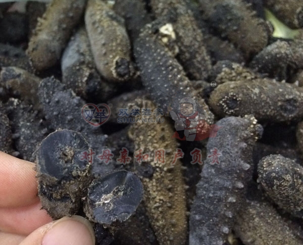顧客訂了海參后,首先要做的就是一個個精挑細選海參,瞧,每一個砸開的海參,斷面膠質層都這樣厚厚的亮亮的,深海野生海才有的特點之一!