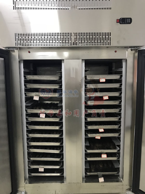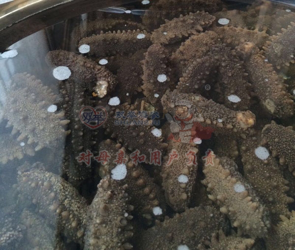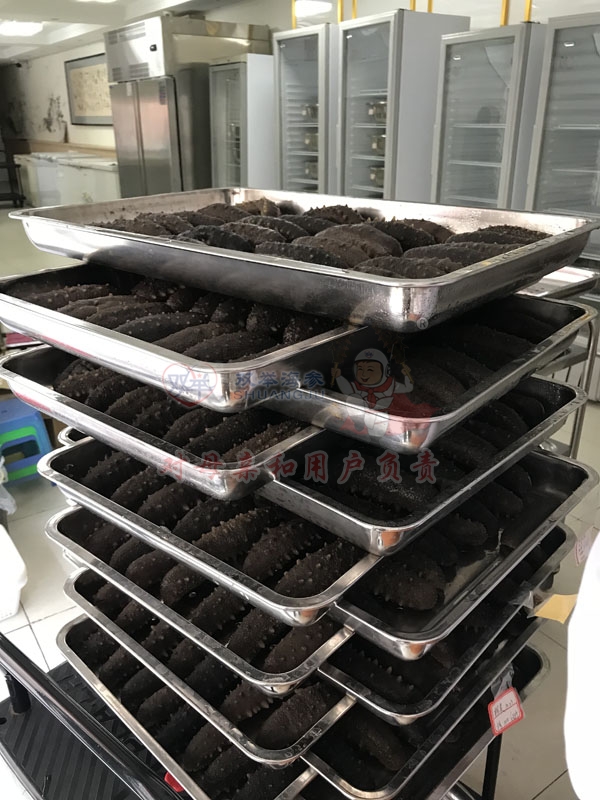 發(fā)泡中的海參,除了煮和自然冷卻的過程,其它時間都在泡在保鮮冰柜中,每一盆就是一位顧客的海參,都貼有標簽,清楚明白一目了然。